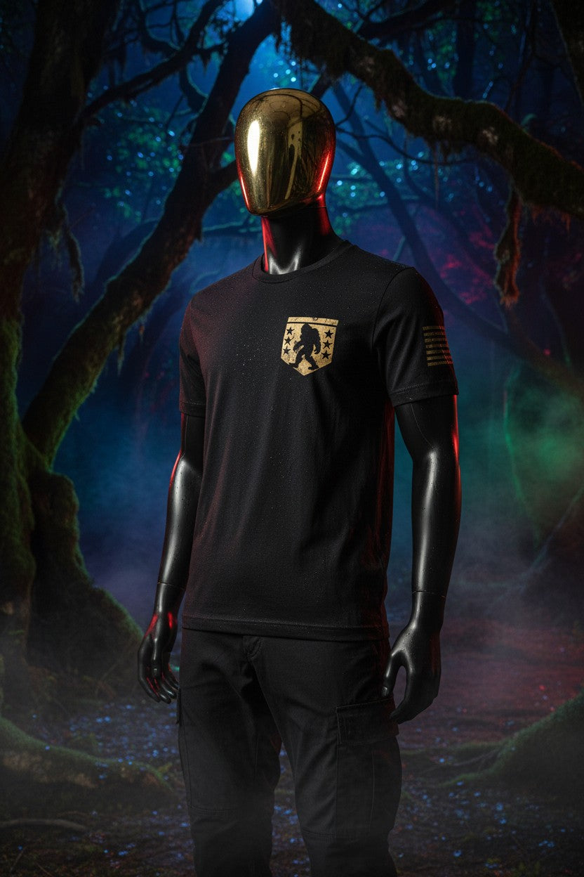 The main detailed artwork is printed on the back of the shirt. There is also a left chest print and the flag is printed (the correct way, with the stars advancing) on the right sleeve.